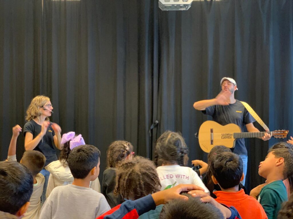 Hem gaudit del conte «En Jan i la mongetera de les paraules» de la mà de «Vivim del cuentu». Ens ha encantat escoltar i ser partícips d’aquesta història tan divertida!